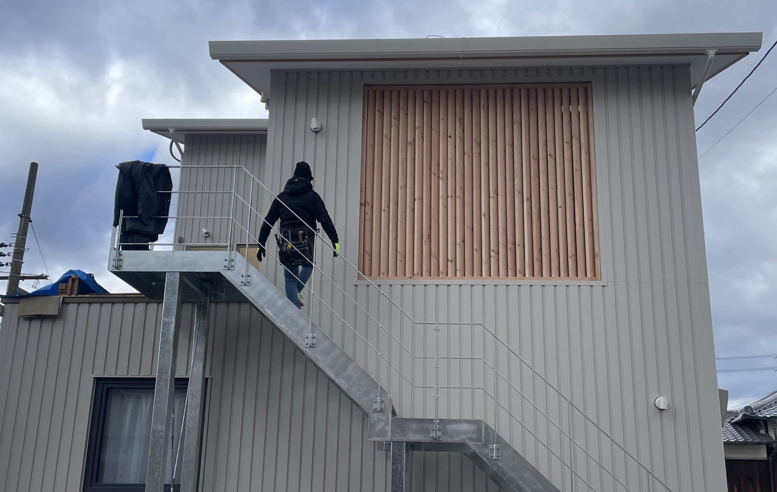 こちらの写真は、外観のアクセントにもなっている大きな木のルーバーを外側から撮影したものです。