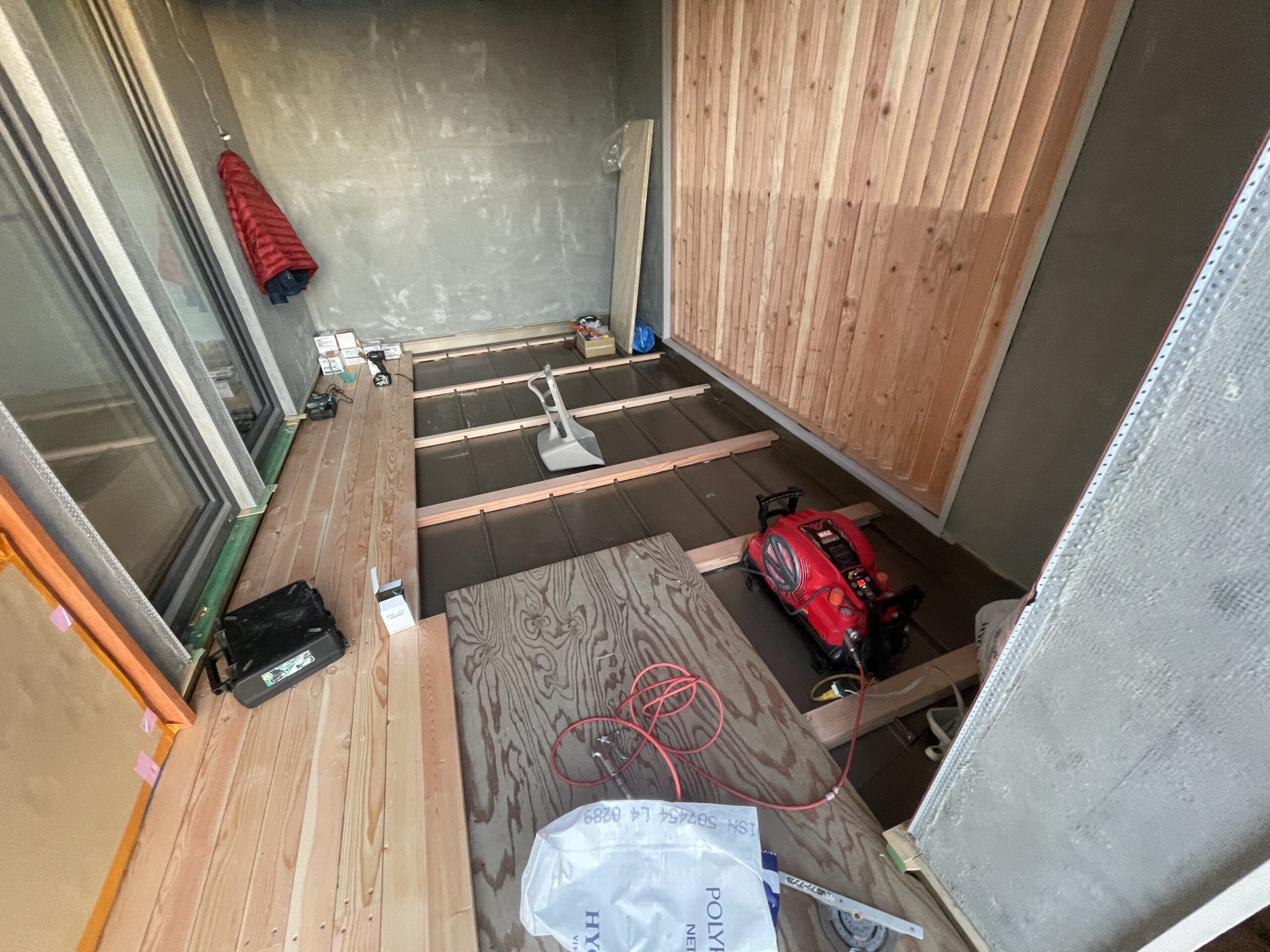 こちらの写真は、バルコニー部分の床を施工している様子です。